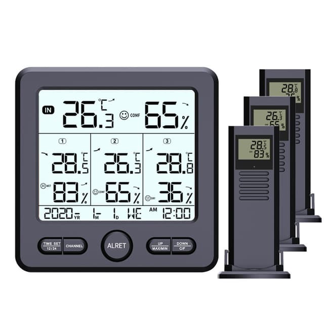 Digitaalinen lämpömittari/kosteusmittari, jossa 3 kauko-anturia Musta