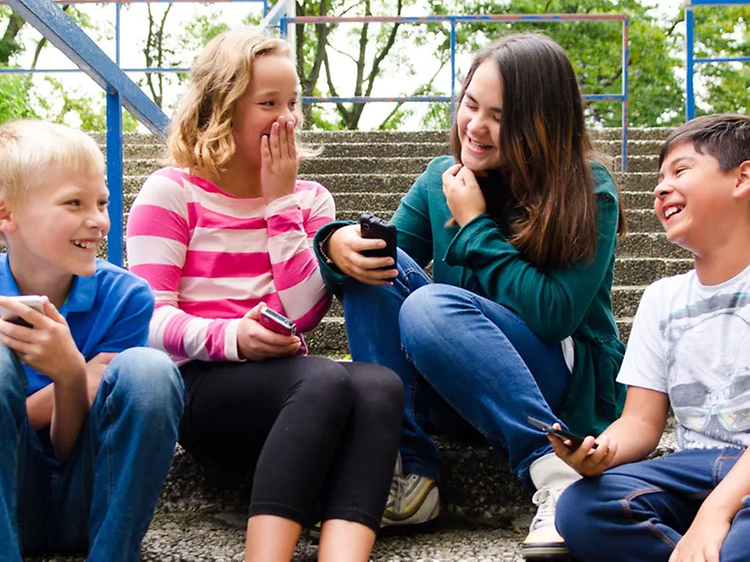 nauravat lapset istumassa portaikossa puhelimet käsissään