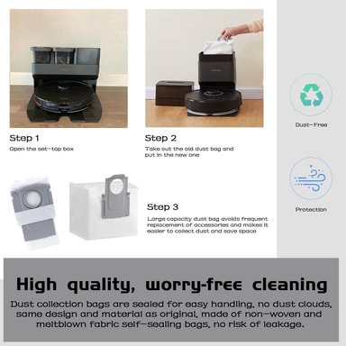 Pölynimuripussit sopivat Xiaomi Roborock S7 MAXV Ultra / S8 / S8 Pro S8+ / T8 / Q7 / Q7 MAX / Q7 MAX+ robottipölynimureihin. Ne ovat tiukkoja ja kestäviä ja helppo vaihtaa ilman roiskeita.