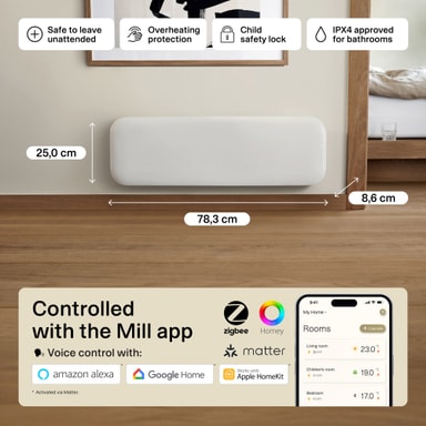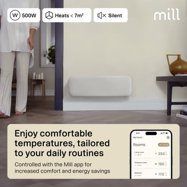 Kompakti Mill Invisible Wi-Fi Gen4 -lämpöpaneeli lämmittää enintään 7 m² huoneita. Siinä on elektroninen termostaatti, ja se on turvallinen käytettäväksi kosteissa tiloissa. Se voidaan yhdistää Mill Wi-Fi -sovellukseen tehostettua ohjausta varten.Tutustu ominaisuuksiin