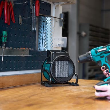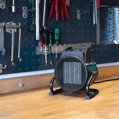 Diese Elektroheizung hat auch eine Ventilatorfunktion. So können Sie sie im Sommer zur Belüftung Ihrer Werkstatt oder Ihres Wohnwagens verwenden.