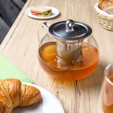SUUNNITTELU: Tämä tyylikäs lasinen teekannu tekee vaikutuksen yksinkertaisella mutta modernilla muotoilullaan. Se on erityisen käytännöllinen ohuen kahvan ja hyvin harkitun kannen ja suodattimen ansiosta!
