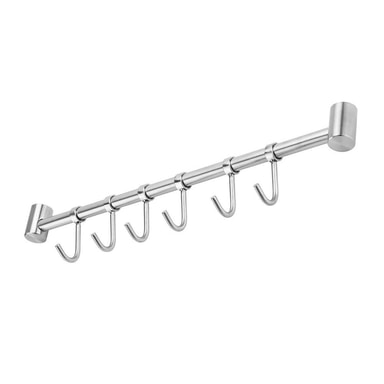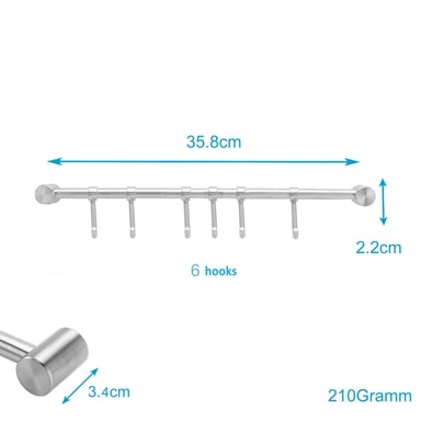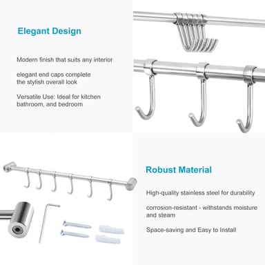Intirilife koukkuteline Valmistettu ruostumattomasta teräksestä, se on helppo koota ja sopii täydellisesti keittiöösi. Ihanteellinen keittiövälineiden, kuten lusikoiden, kattiloiden, kuppien, pannujen, ripustamiseen, käsineet, pyyhkeet jne. Siirrettävien koukkujen avulla voit säätää etäisyyttä optimaalisesti. Klassisen muotoilun ansiosta voit myös käyttää tartuntakiskoa koko talossa! Tangossa on 6 koukkua ja se kestää enintään 20 kg. Ripustuskisko on kiinnitettävä 2 ruuvilla.