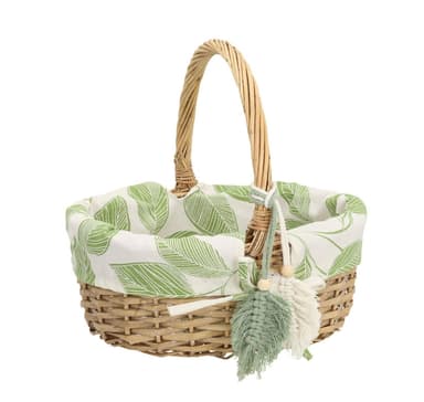 Korin materiaali: käsin kudottu luonnonvärinen pajupunottu kangas. Tekstiilivuori: vihreälehtikuvioinen puuvillakangas.