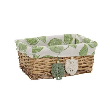 Korin materiaali: käsin kudottu luonnonvärinen pajupunottu kangas. Tekstiilivuori: vihreälehtikuvioinen puuvillakangas.