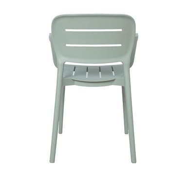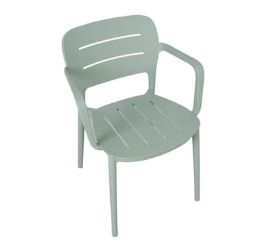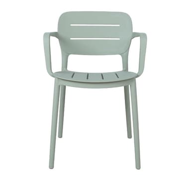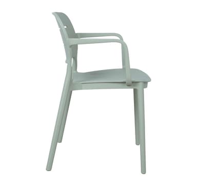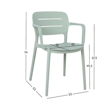 Tuoli MANGO vihertävänharmaata muovia. Tuoli sopii sekä sisä- että ulkokäyttöön, kotona, kahvilassa tai toimistossa. Tuolin kokonaismitat ovat 53x53xK79cm. Istuimen leveys 42cm, istuimen syvyys 42cm, istuimen korkeus 45,5cm. Käsinojan korkeus maasta 67,5cm. Painoraja 100kg. Materiaali: Polypropeeni (PP). Polypropeeni on kevyt ja erittäin kestävä materiaali, joka sietää hyvin kosteutta ja UV-säteilyä. Polypropeeni on kierrätettävää, mikä tekee siitä ympäristöystävällisen valinnan. HOITO Polypropeenista valmistettuja kalusteita on helppo huoltaa – pyyhi ne vain kostealla liinalla. SÄILYTYS Yleisesti ottaen polypropeenista valmistetut puutarhakalusteet ovat riittävän kestäviä kestämään normaaleja talviolosuhteita, mutta suosittelemme silti muovikalusteiden säilyttämistä sisätiloissa, jos mahdollista. Jos kalusteiden vieminen sisälle ei ole mahdollista, peitä ne säänkestävällä peitteellä suojataksesi niitä lumelta, jäältä ja kosteudelta. Vältä raskaiden esineiden asettamista kalusteiden päälle, sillä kylmyys voi haurastuttaa materiaalia ja paino voi vahingoittaa niitä.