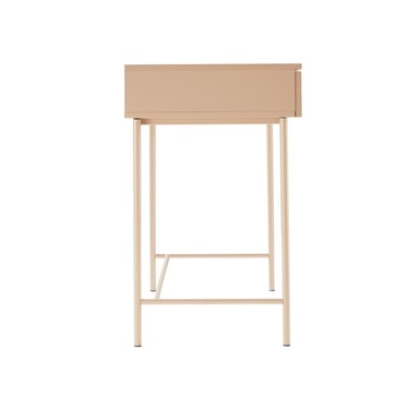 Työpöytä SEQUENCE 120x50xH79cm, cappuccino. Pöytälevy ja runko on valmistettu huonekalulevystä. Laatikon etuosat: koristeellinen uurrettu MDF-paneeli. Pöytä on viimeistelty kestävällä polyuretaanimaalilla. Pöydän jalat ja runko on valmistettu metallista ja pulverimaalattu.