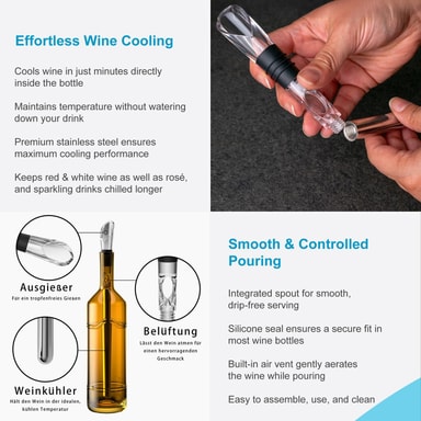 Kaattimessa on integroitu tuuletustoiminto, joka saa punaviinin hengittämään hyvin, se optimoi makuelämyksen. Samalla jäähdytystanko voi antaa viinin jäähtyä laimentamatta sitä, joten se on aina täydellisessä lämpötilassa Käsittely on erittäin helppoa eikä vaadi jääkuutioita. Jäähdytyspuikkoa tulee säilyttää pakastimessa vähintään 2 tuntia, sitten laitat sen pulloon, jossa se säätelee lämpötilaa jopa 1 tunnin ajan. Setti on uudelleenkäytettävä, kestävä ja kaatoputki helpottaa kaatamista. Jos olet Viinin ystävä ja mielellään vastaanottaa vieraita, se on ihanteellinen väline juhliin, matkoille, retkeilyyn, baareihin ja myös yrityslahjaksi.