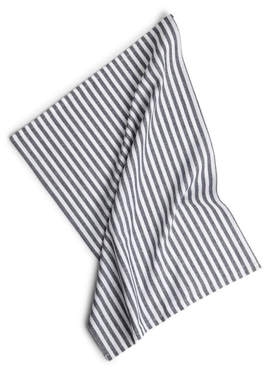 Randiga kökshanddukar från Kosta Linnewäfveri tillverkade av 70% återvunnen bomull.