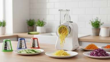 Equip Salad Maker -viipalointikoneessa on 4 ruostumattomasta teräksestä valmistettua kartiota leikkaamiseen, raastamiseen, ja julienne-leikkaamiseen. Laite on kompakti malli, joka on helppo säilyttää ja kätevä käyttää.Tutustu ominaisuuksiin
