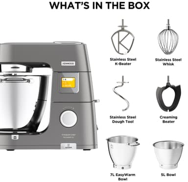 Kenwood Chef XL Titanium Patissier -yleiskone on varustettu 7-litraisella EasyWarm-kulholla, 5-litraisella lisäkulholla, BakeAssist-kosketusnäytöllä sekä lukuisilla esiasetetuilla SimpleTouch-ohjelmilla.Tutustu ominaisuuksiin