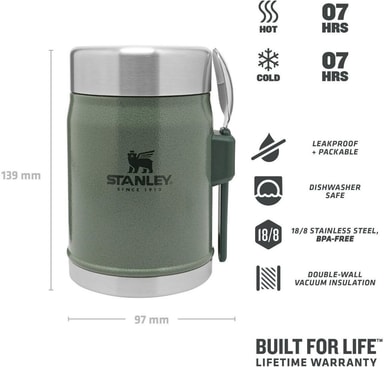 Pieni ja kätevä ruokatermos, joka on tarkoitettu henkilökohtaiseen käyttöön. Ruokatermoksen tyhjiöeristys pitää ateriasi lämpimänä, ja voit nauttia sen helposti mukana tulevalla sporkilla (lusikka+haarukka -ruokailuväline), joka mahtuu hyvin ruokatermoksen leveään aukkoon. Tämä Stanley ruokatermos on valmistettu BPA -vapaasta materiaalista, ja sen voi pestä turvallisesti astianpesukoneessa.
