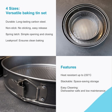 Yksittäisten muottien halkaisijat ovat: 28, 26 , 24, 18 cm. Muotit on helppo puhdistaa käsinpesulla.