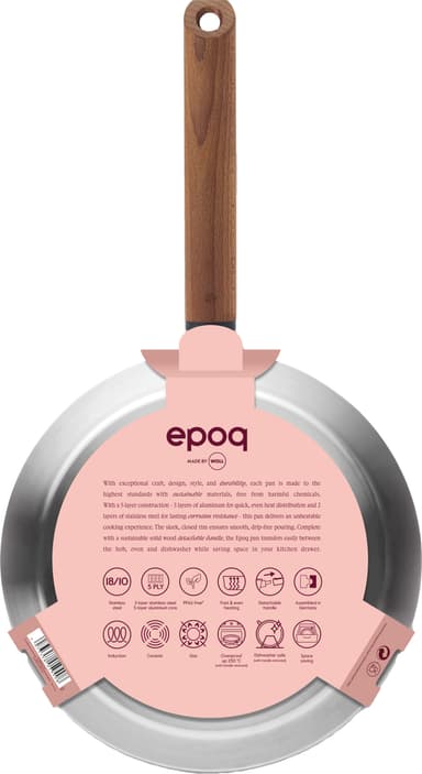Epoq paistinpannu 24cm 1524WLCS-EPO on valmistettu 5-kerroksisesta ruostumattomasta teräksestä. 3,5 mm paksu pohja takaa optimaalisen paistotuloksen ja soveltuu induktioliesille. Pannussa on irrotettava puukahva. Kestää konepesun.Tutustu ominaisuuksiin