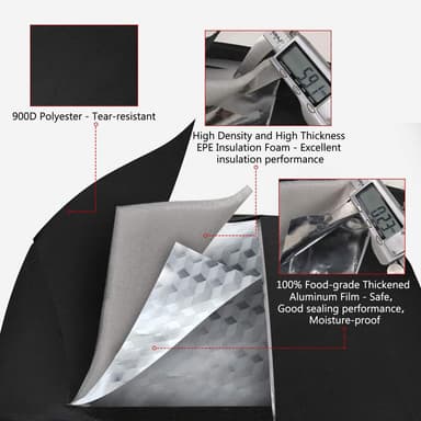 Tehokas eristys: Valmistettu korkealaatuisesta Oxford-kankaasta ja vuorattu alumiinifoliolla, eristyspussimme säilyttää tehokkaasti lämpöä ja pitää ateriat lämpiminä ja herkullisina, kunnes on aika syödä.