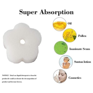 Öljyä imevä sieni voi kerätä veden pinnalla kelluvaa vaahtoa, limaa, likaa ja rasvaa, se pidentää suodattimen käyttöikää ja parantaa suodattimen tehokkuutta. Aseta sieni vedellä täytettyyn uima-altaaseen tai kylpyammeeseen ja se alkaa imeä öljyä itsestään. Kun sieni on täysin imeytynyt, purista öljy pois, huuhtele se ja sitten sientä voidaan käyttää uudelleen.