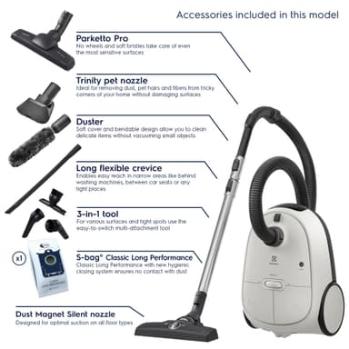 Electrolux Clean 600 Bagged -imurin suulakkeessa on automaattinen lattiatila. Imuri on intuitiivisen helppokäyttöinen, tehokas ja tasaisen varmatoiminen.