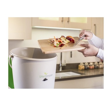 Urban Composter City käyttää anaerobista kompostointia (Bokashia) keittiön romujen käymiseen suoraan ämpäriin. Tämä prosessi minimoi epämiellyttävät hajut ja kärpäset. Leikkaa vain ruokajätteet pieniksi paloiksi, suihkuta Urban Composter Compost Accelerator Spray:tä ja sulje kansi.