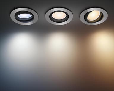 Upotettu Philips Hue Milliskin -spottivalo, jossa on GU10-kanta, tarjoaa lämpimästä kylmään vaihtelevaa valkoista valoa kolmella himmennettävällä, säädettävällä spottipäällä. Se sopii 70 mm leikkaukseen ja sitä voi ohjata Hue-sovelluksella.Tutustu ominaisuuksiin
