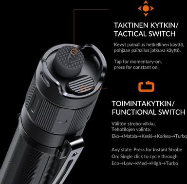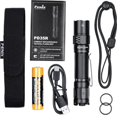 Fenix PD35R -taskulamppu on kompakti ja tehokas ladattava taskulamppu, joka korvaa suositun UC35 V2.0 -mallin. Häikäisevä max. 1700 lumenin valovoima ja pitkälle max. 353 metriä näyttävä valokeila nostaa PD35R:n kompaktien taskulamppujen valioluokkaan. PD35R:n käyttö on todella nopeaa ja yksinkertaista sen päädyssä olevista kahdesta painonappikytkimestä. Isosta painonapista kytket valon päälle ja pienemmästä napista siirryt eri kirkkaustilojen välillä. PD35R ladataan EU-latausstandardin mukaisella USB C-latausliittimestä. Fenix PD35R on suunniteltu vaativalle harrastajalle, viranomaisille ja erä- ja retkeilykäyttöön, kun vaadit erittäin kompaktia, kestävää ja toimintavarmaa taskulamppua suorituskyvystä tinkimättä.
