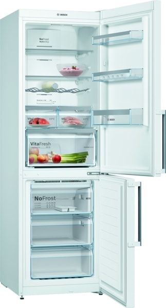 Bosch Series 4 KGN367WEQ jääkaappi/pakastin: tyylikäs, valkoinen, NoFrost-yksikkö, jossa VitaFresh-tekniikka, LED-valaistus ja Multi Airflow-järjestelmä optimaalista tuoreutta varten.Tutustu ominaisuuksiin