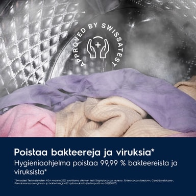 Swissatestin sertifioima antiallergia-ohjelma yhdistää tehokkaan pesuohjelman ja höyryn poistaakseen allergeenit ja bakteerit suosikkivaatteistasi. Näin voit nauttia hygieenisesti puhtaista vaatteista pesusta toiseen. *Testattu Staphylococcus aureus, Enterococcus faecium, Candida albicans, Pseudomonas aeruginosa ja MS2-bakteriofagi ulkoisessa testissä, jonka suoritti Swissatest Testmaterialien AG 2021 (testiraportti nro. 202120117)