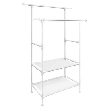 Vaateteline, jossa on 2 vaatetankoa ja 2 säilytyshyllyä, valkoista metallia