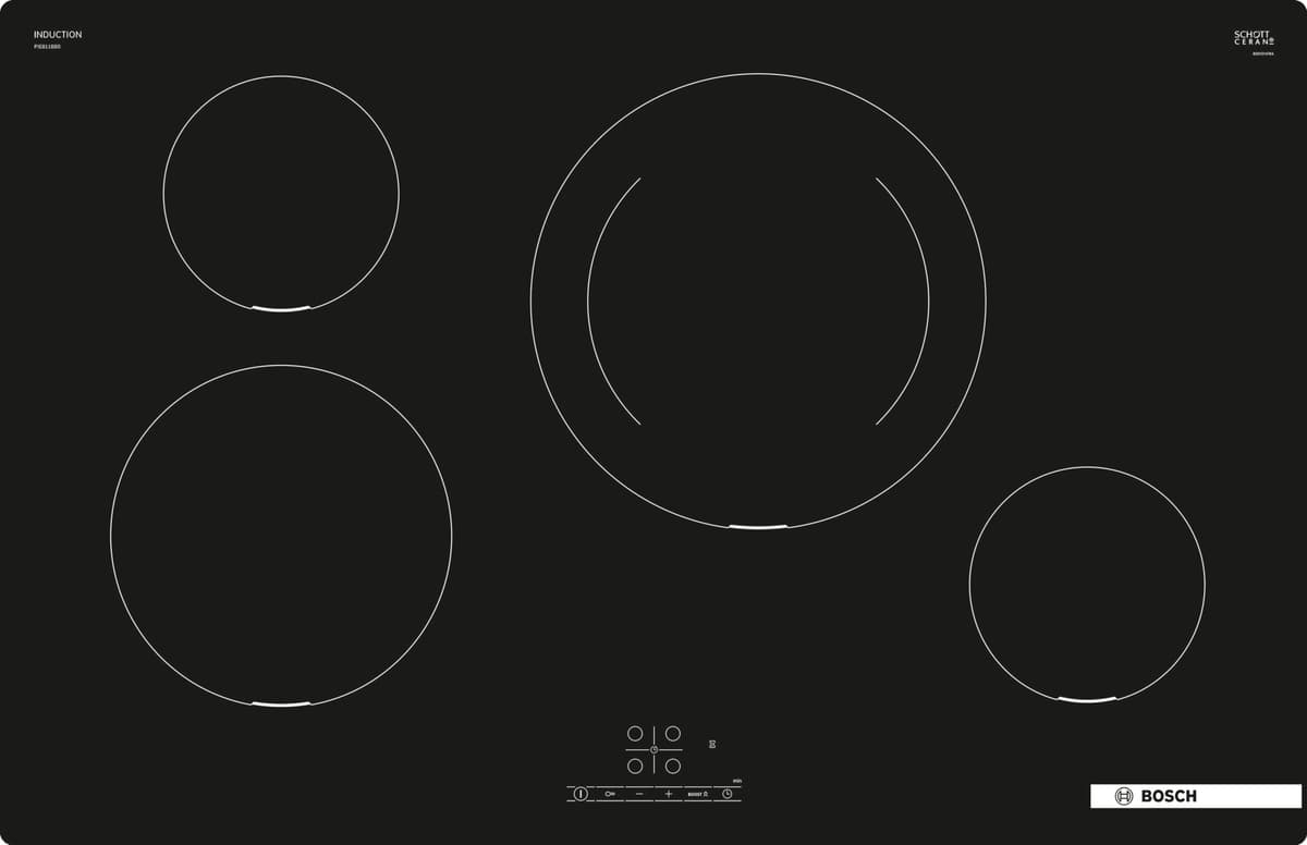 Bosch PIE811BB5E induktioliesi: 80 cm, 4-alueinen keitto TouchSelect-toiminnolla, 17 tehotasoa, PowerBoost ja tyylikäs kehyksetön muotoilu moderneihin keittiöihin.Tutustu ominaisuuksiin
