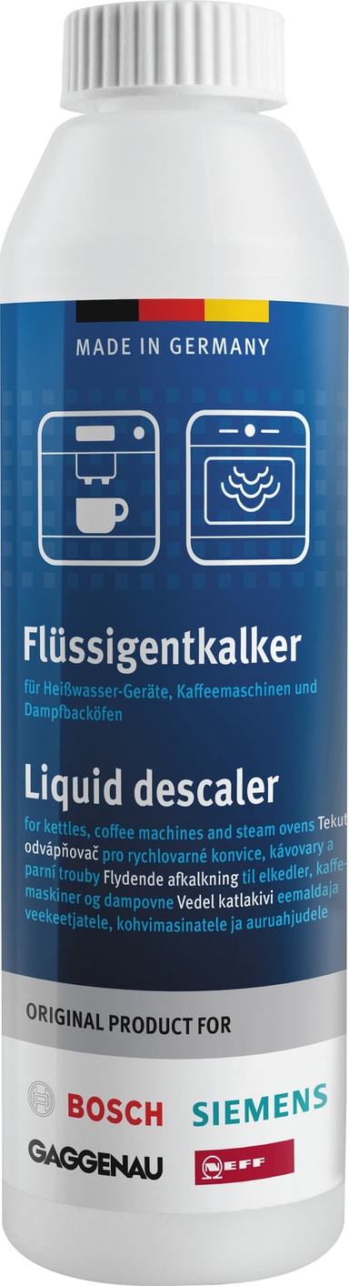 Nestemäisellä Bosch-kalkinpoistoaineella puhdistat kalkkijäämät teepannuista, kahvinkeittimistä ja höyryuuneista, parantaen niiden käyttöikää ja suorituskykyä. Maantuva aine.Tutustu ominaisuuksiin