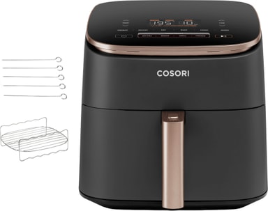 1725 W Cosori Turbo Blaze -kiertoilmakypsentimessä on 6 litran paistokori sekä 9 esiasetettua toimintoa, joiden avulla voit paistaa, paahtaa, lämmittää, grillata ja paljon muuta. Tarttumattomat, konepestävät osat takaavat vaivattoman puhdistuksen.Tutustu ominaisuuksiin