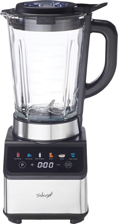 1200 watin Sobczyk Digital -tehosekoittimessa on 1,5 litran lasikulho ja 6 nopeusasetusta, joilla voi murskata pähkinöitä, hedelmiä, vihanneksia ja jopa jäätä. Digitaalisesta näytöstä voit valita eri nopeuksia ja esiasetettuja ohjelmia.Tutustu ominaisuuksiin
