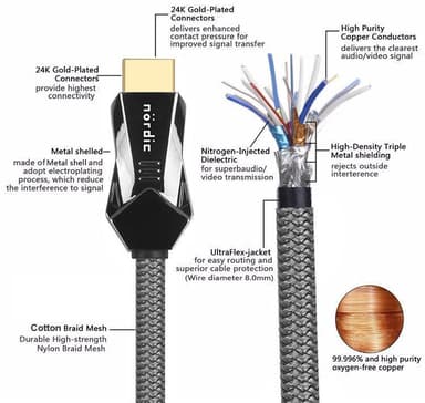 Tämä NÖRDIC Ultra High Speed HDMI -kaapeli on sertifioitu HDMI-organisaation Ultra High Speed HDMI -kaapelin sertifiointiohjelman mukaisesti, mikä tarkoittaa, että kaapeli täyttää kaikki ohjelmassa määritellyt tekniset vaatimukset, mukaan lukien resoTutustu ominaisuuksiin
