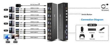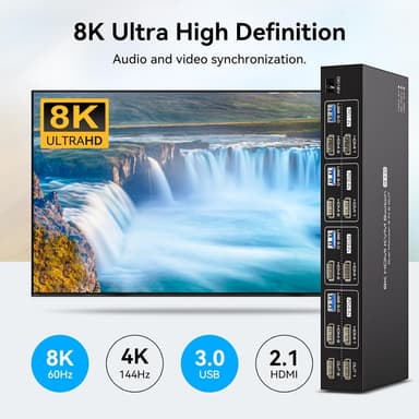 KVM Switch kahdelle näytölle ja 4 tietokoneelle helpottaa kahden näytön ja neljän USB 3.0 -laitteen jakamista neljän tietokoneen välillä. Voit vaihtaa tietokoneiden välillä helposti kaukosäätimen tai paneelin painikkeilla. Se tukee jopa 8K@60Hz resoluutiota ja on taaksepäin yhteensopiva pienempien resoluutioiden kanssa. Kytkimen kaksi tilaa ja neljä nopeaa USB 3.0 -porttia tekevät siitä ihanteellisen pöytäkoneelle, toimistolle tai luokkahuoneeseen. Plug and play -asennus ilman ohjaimia tekee siitä käyttäjäystävällisen ja monipuolisen.