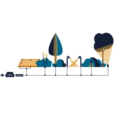 MERKINTÄ! Muutettujen EU-direktiivien vuoksi Garden Plug & Play -laitteella on ollut uudet 12 V: n liittimet 1. toukokuuta 2018 lähtien. Vanhaa valaistusjärjestelmää täydennettäessä vanhan ja uuden välillä on siirtymiä luokassa ""Kaapelit ja liitännät"".