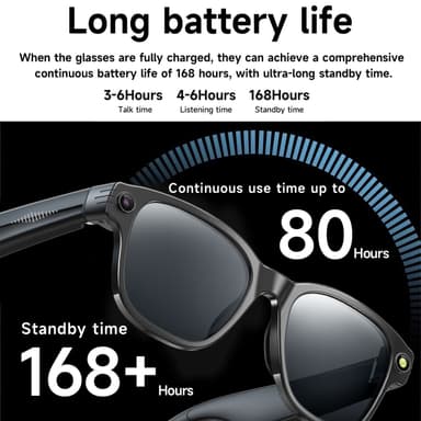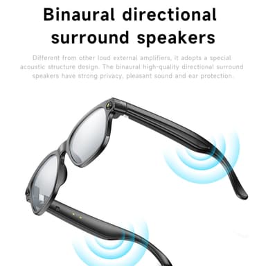 Korkealaatuinen ääni: Uppoudu korkealaatuiseen ääneen älykkäillä AI-laseilla. Niissä on kahden mikrofonin kohinanvaimennusjärjestelmä, joka takaa selkeät puhelut ja äänen tallennuksen jopa meluisissa ympäristöissä. Suuntaavat stereokaiuttimet tarjoavat rikkaan ja mukaansatempaavan äänikokemuksen, joka on samalla yksityinen ja korvia säästävä. Nämä lasit sopivat täydellisesti musiikin kuunteluun, puheluiden soittamiseen ja videoiden katseluun ilman häiriöitä. Nauti kristallinkirkkaasta äänestä, joka parantaa viihdettäsi ja pitää sinut yhteydessä maailmaan ympärilläsi. Ne ovat täydelliset ammattilaisille, jotka tarvitsevat selkeitä puheluita, ja musiikin ystäville, jotka arvostavat korkealaatuista ääntä.
