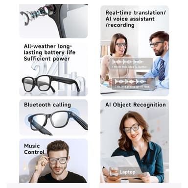 Hands-free AI avustaja: Nauti hands-free avustajasta älykkäillä AI-laseilla. Sisäänrakennettu AI-avustaja mahdollistaa reaaliaikaisen kääntämisen, kohteen tunnistuksen ja helpon pääsyn tietoon. Käytä ääntäsi herättääksesi avustajan, esittääksesi kysymyksiä ja nauttiaksesi AI-keskusteluista. Nämä lasit sopivat täydellisesti tiedon hakemiseen, kielimuurien ylittämiseen ja yhteydenpitoon liikkeellä ollessa. Koe älykkyyden ja mukavuuden yhdistelmä, joka tekee jokapäiväisestä elämästäsi tehokkaampaa ja nautinnollisempaa. Nämä lasit ovat ihanteelliset opiskelijoille, matkailijoille ja kaikille, jotka haluavat pysyä ajan tasalla ja olla yhteydessä ympäristöönsä.
