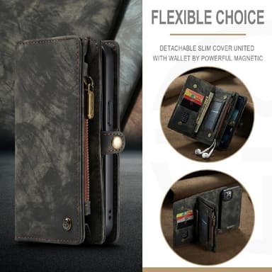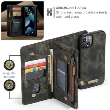 CASEME Monitoiminen 2-in-1-lompakko TPU+jaettu nahkainen puhelinkuori iPhone 13 Minille - musta Valmistettu retrotyylisestä aidosta hal kaistusta nahasta + TPU-materiaaleista, korkea laatu ja kestävyys.Tutustu ominaisuuksiin