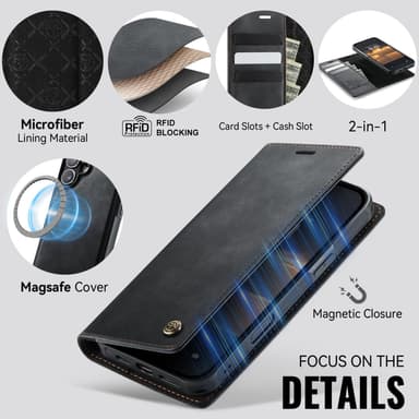 Tämä tyylikäs puhelinkotelo yhdistää käytännöllisyyden ja muotoilun. Se on valmistettu kestävästä TPU:sta ja PU-nahasta, tarjoten mukavan otteen ja luotettavan suojan iskuilta ja pudotuksilta. Pehmeä mikrokuituvuori suojaa puhelinta naarmuilta ja kulumiselta. Kotelo tukee täysin MagSafe- ja langatonta latausta, joten voit ladata puhelimesi helposti ilman kotelon poistamista. Magneettinen, irrotettava lompakkorakenne sisältää kolme korttipaikkaa ja setelitaskun, joten voit kuljettaa henkilökortit, luottokortit ja käteisen kätevästi. RFID-suojaus estää luvattoman skannauksen ja suojaa henkilökohtaisia tietojasi. Monitoimiteline mahdollistaa handsfree-katselun videoille, lukemiselle tai videopuheluille.
