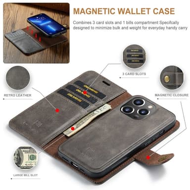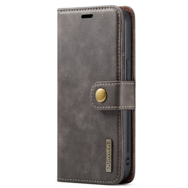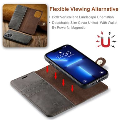 Nahkalompakkokotelo, jossa on magneettisesti irrotettava sisäkuori.