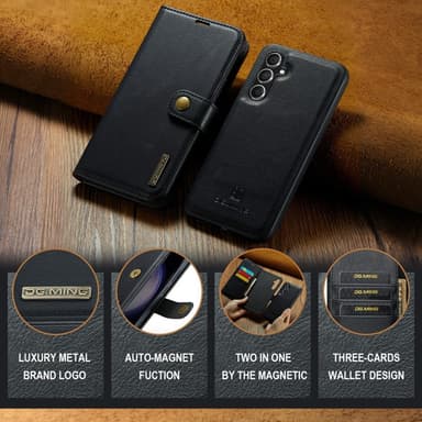 Nahkalompakkokotelo, jossa on magneettisesti irrotettava sisäkuori.