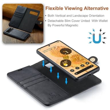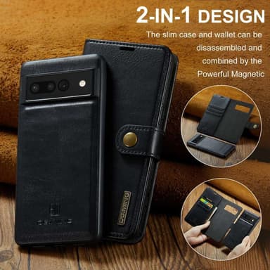 o Google Pixel 7 Prolle iskunkestävä irrotettava matkapuhelimen kansi lompakkotelineella - musta Tässä kotelossa on 2-in-1-malli, jossa on halkaistu nahkainen lompakkokuori ja irrotettava nahkapäällysteinen PC-takakuori, joka voidaan kiinnittää yhteen magnetismin avulla. Laadukkaat materiaalit, joissa on hieno ammattitaito, takaavat tyylikkään ilmeen ja mukavan käden tunteen.