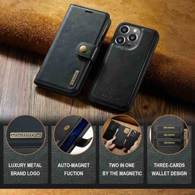 o iPhone 14 Prolle iskunkestävä irrotettava matkapuhelimen kansi lompakkotelineella - musta Tässä kotelossa on 2-in-1-malli, jossa on halkaistu nahkainen lompakkokuori ja irrotettava nahkapäällysteinen PC-takakuori, joka voidaan kiinnittää yhteen magnetismin avulla. Laadukkaat materiaalit, joissa on hieno ammattitaito, takaavat tyylikkään ilmeen ja mukavan käden tunteen.