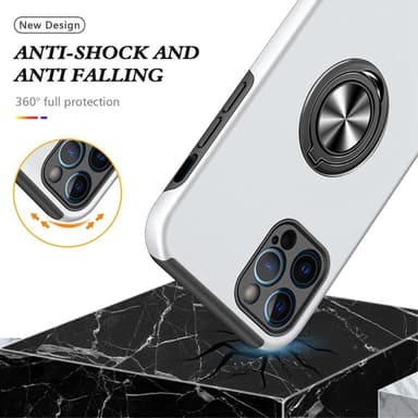 Täysi suojaava hybridipuhelimen suojakotelo Rengasmuotoinen Kickstand Design iPhone 14 Pro Maxille - Hopea Integroitu rengaspidike mahdollistaa helpon käytön yhdellä kädellä, voi toimia myös 360 asteen pyörivänä jalustana Sisäänrakennettu CD-suonet mTutustu ominaisuuksiin