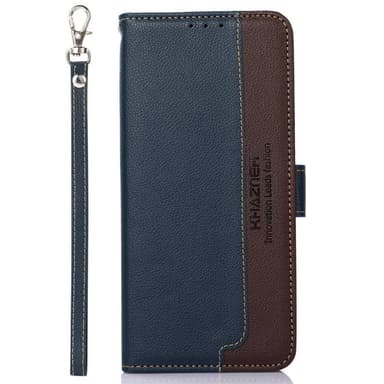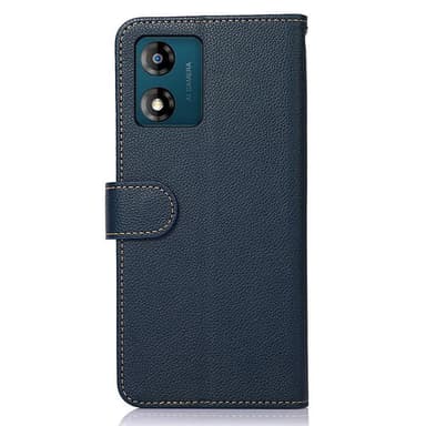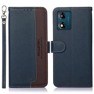 KHAZNEH RFID Varkaudenestoinen Litchi Texture Wallet Stand -kotel o Motorola Moto E13 4G -mallille - sininen/ruskea Valmistettu laadukkaasta, sileästä ja pehmeästä Korttipaikkaa tukee edistyksellinen RFID-tekniikka, joka estää signaalit tehokkaasti jTutustu ominaisuuksiin