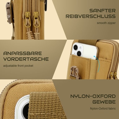 Olkahihnalla varustettua vyötärölaukkua voidaan käyttää joustavasti. Kuntoiluun, lenkkeilyyn ja muihin ulkoilma-aktiviteetteihin. Ihanteellinen matkapuhelinten, avainten, GPS-laitteiden, pienten työkalujen jne. säilytykseen.