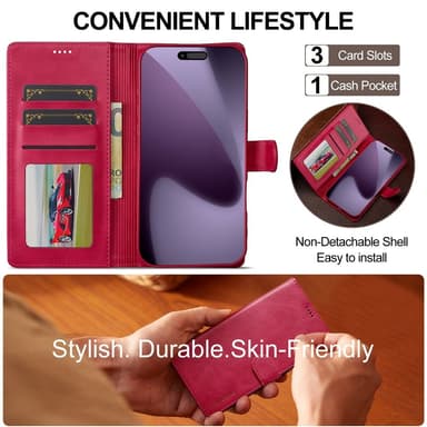 Tämä tyylikäs kotelo on valmistettu PU-nahasta, jossa on vasikannahkainen rakenne, sekä TPU-materiaalista, tarjoten pehmeän tuntuman ja hienostuneen ulkonäön. Se suojaa puhelinta kauttaaltaan 360 asteen suojalla. Kaksi korttipaikkaa, valokuvapaikka ja setelitasku mahdollistavat lompakon jättämisen kotiin. Taitettava jalusta mahdollistaa säädettävän katselukulman handsfree-käyttöön. Vahva magneettisuljin pitää puhelimen, rahat ja kortit turvassa. Varattu kaiutinaukko mahdollistaa puhumisen kotelo suljettuna.