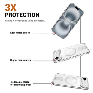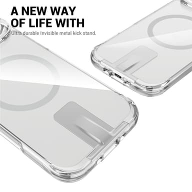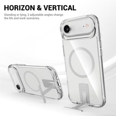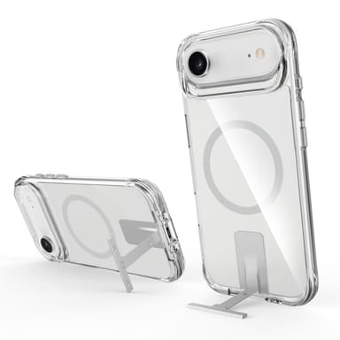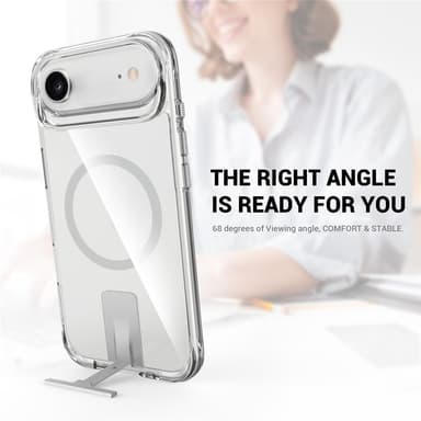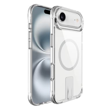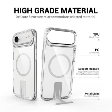 Tämä läpinäkyvä suojakuori yhdistää tyylin ja käytännöllisyyden. Sisäänrakennettu magneettirengas tukee langatonta latausta ja on täysin yhteensopiva MagSafe-lisävarusteiden kanssa. Valmistettu TPU:sta ja PC:stä, tarjoten kestävän suojan iskuilta ja pudotuksilta. Kirkas materiaali korostaa puhelimen alkuperäistä ulkonäköä. Alumiiniseoksesta valmistettu jalusta mahdollistaa vaivattoman katselun sekä vaaka- että pystyasennossa. Korotetut reunat suojaavat näyttöä ja kameraa naarmuilta ja iskuilta.