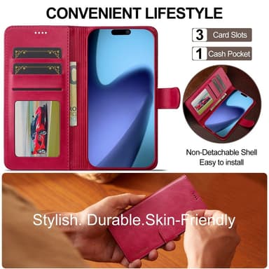Tämä tyylikäs kotelo on valmistettu PU-nahasta, jossa on vasikannahkainen rakenne, sekä TPU-materiaalista, tarjoten pehmeän tuntuman ja hienostuneen ulkonäön. Se suojaa puhelinta kauttaaltaan 360 asteen suojalla. Kaksi korttipaikkaa, valokuvapaikka ja setelitasku mahdollistavat lompakon jättämisen kotiin. Taitettava jalusta mahdollistaa säädettävän katselukulman handsfree-käyttöön. Vahva magneettisuljin pitää puhelimen, rahat ja kortit turvassa. Varattu kaiutinaukko mahdollistaa puhumisen kotelo suljettuna.