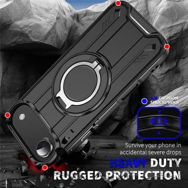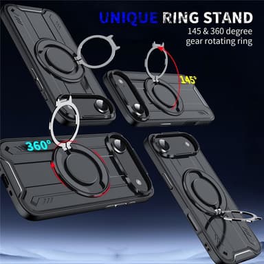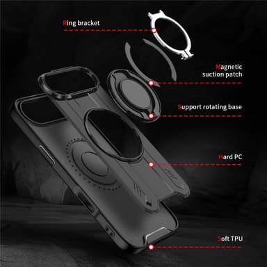 Tämä puhelinkotelo on valmistettu kovasta PC:stä ja pehmeästä TPU:sta, tarjoten kestävyyttä ja joustavuutta. Sisäänrakennettu 360° pyörivä rengas toimii kätevänä jalustana handsfree-katseluun, täydellinen videoihin ja videopuheluihin. Magneettirengas mahdollistaa helpon käytön MagSafe-latureiden ja magneettipidikkeiden kanssa kotona ja autossa. Ilmatyynyrakenne suojaa tehokkaasti pudotuksilta. Helppo asentaa ja irrottaa ilman vaurioita laitteelle.