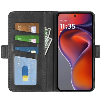 Koe äärimmäinen mukavuus ja suojaus Premium ID -lompakkokotelolla. Tämä tyylikäs kotelo vasikannahkaa muistuttavasta PU-nahasta suojaa puhelintasi naarmuilta ja kolhuilta. Sisäänrakennettu lompakkofunktio korttipaikkoineen ja setelilokeroineen pitää tärkeimmät tavarasi käden ulottuvilla. Säädettävä tukitoiminto mahdollistaa handsfree-viihteen.
